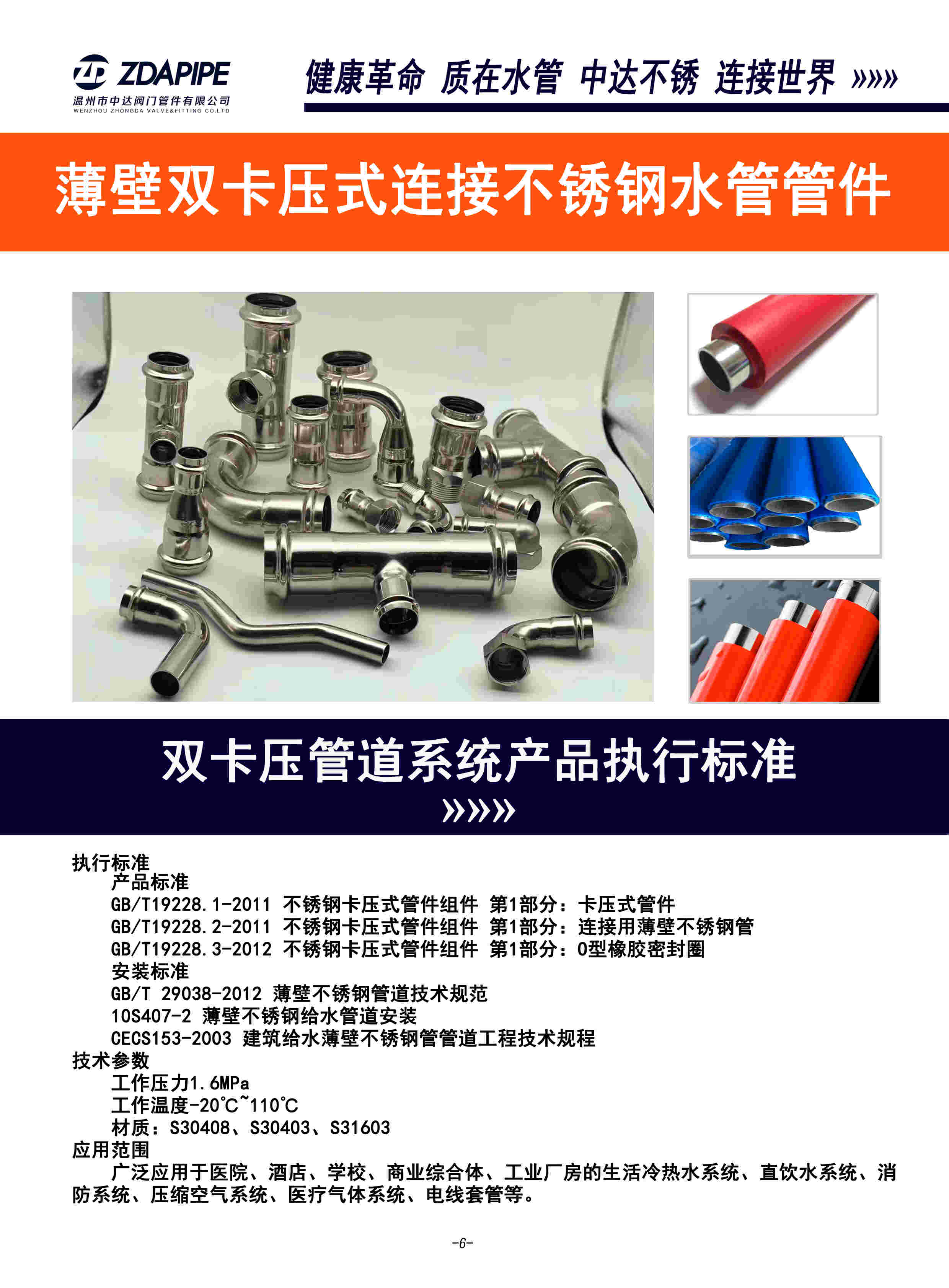 卡壓管件廣泛應(yīng)用于市政自來(lái)水管道工程,新建小區(qū)直飲水工程,工業(yè)與民用 建筑、賓館、公共建筑、睬氣供應(yīng)等分供水系統(tǒng)。給水,排水,二次供水,太陽(yáng)能,水務(wù)工程,自來(lái)水公司,醫(yī)院,學(xué)校,酒店,賓館,天然氣工程,自來(lái)水工程,直飲水工程,家裝水管工程,工業(yè)管道工程,水處理工程,清潔能源工程,綠色能源,核電等領(lǐng)域。健康革命,質(zhì)在水管,中達(dá)不銹,連接世界。